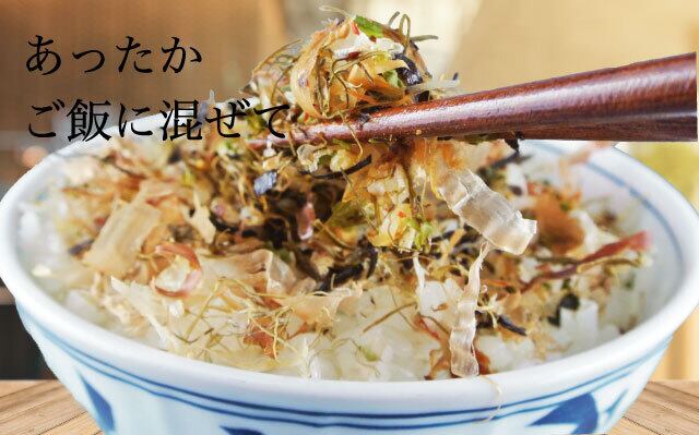 あたたかいご飯にふりかけ、醤油を少し加え、かき混ぜてからお召し上がりください。