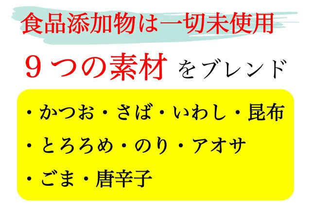 【原材料名】削り節(かつお(国産)、さば(国産)、いわし(国産))、昆布(国産)、海苔(国産)、ごま(国産)、あらめ(国産)、